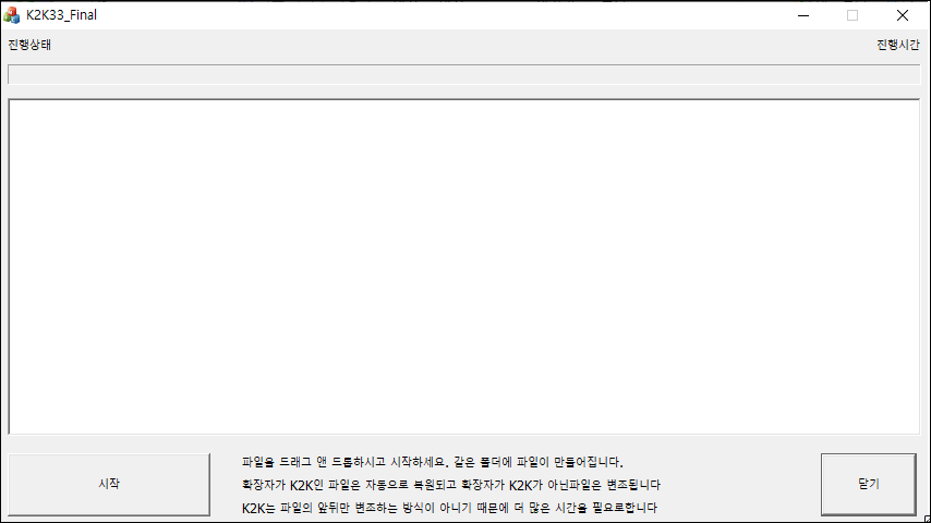 프로그램 이름은 k2k33입니다. 이걸 활용하여 변환 후 확인해볼 수 있습니다. 받은 파일 확장자가 k2k라고 당황할 필요는 없습니다. 그저 암호화된 파일일 뿐이니까요.