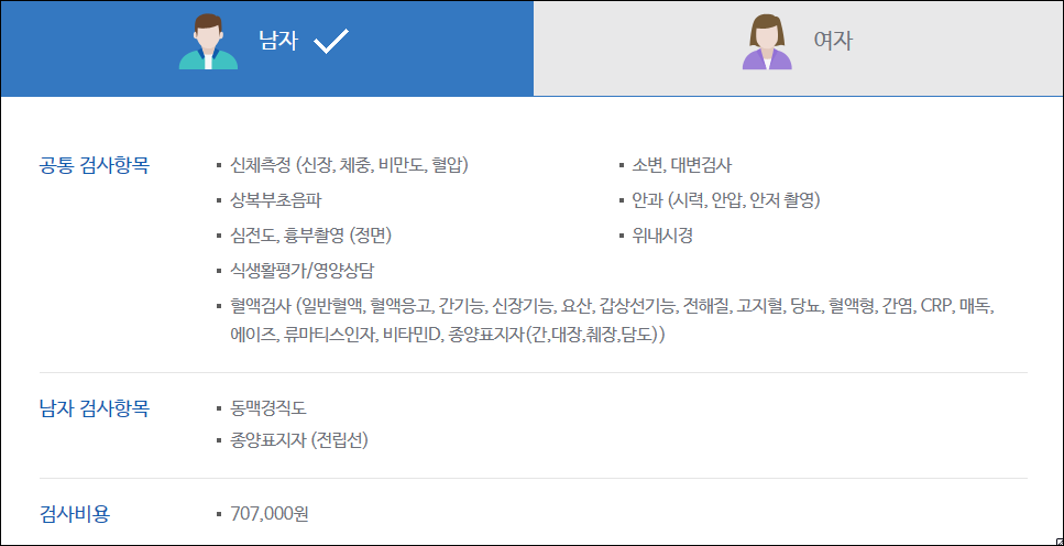 삼성서울병원의 기본 검진 검사비용은 남자는 707,000원, 여자는 757,000원입니다. 아래 검사 항목을 체크해보세요.