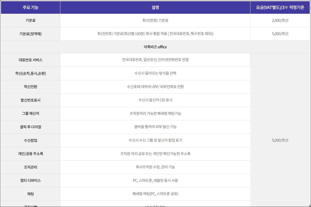 부가서비스로 영상상담, 컨퍼런스, IVR, 콜백, 통계, 녹취, 통합상담, 대표번호 그룹, 문자, 패턴발신, IVR메시지, 감청, 웹팩스, 전국대표번호 등 많이 있습니다.