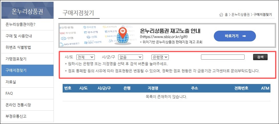내 주변의 구매가능지점을 찾기도 가능합니다. 온누리상품권 구매점찾기(바로 가기)에서 가능한데요. 시/도 선택하고 시/군/구 선택 후 은행명으로 검색하면 되겠습니다.
